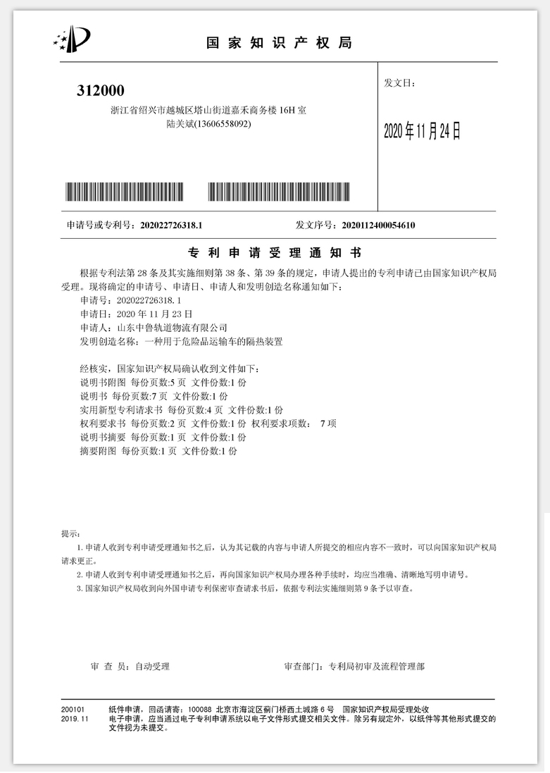 我公司在2020年11月21日申请了两项国家专利,申请已被国家知识产权局受理